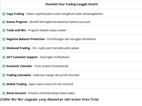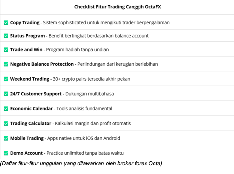 Satu lagi keunggulan Octa dalam sektor fitur-fitur trading, yaitu Octa trading gadgets AI yang telah mengantarkan broker ini meraih penghargaan prestisius "Best Use of AI in Fintech 2025" dari Global Business Magazine. Fitur revolusioner ini menghadirkan OctaVision sebagai mentor digital berbasis AI yang mampu menganalisis riwayat trading secara mendalam dan memberikan rekomendasi personal untuk meningkatkan kemampuan pengambilan keputusan trader.