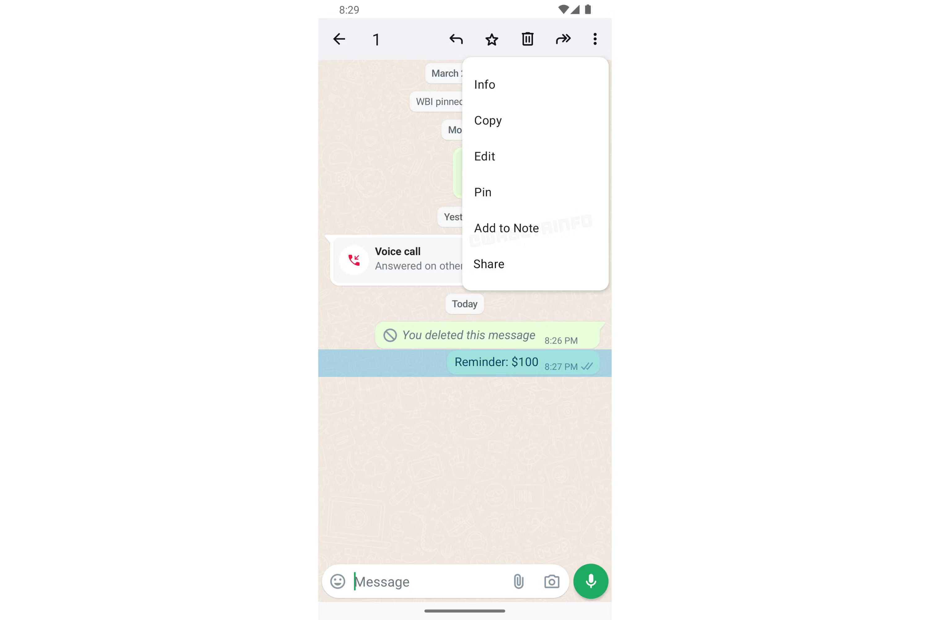 Opsi ini akan tersedia dalam opsi pesan yang memungkinkan pengguna dengan mudah melampirkan pesan yang dipilih ke catatan hanya dengan beberapa ketukan. Daripada menambahkan catatan secara manual, langsung di layar info obrolan, pengguna juga akan dapat menambahkan pesan tertentu ke catatan mereka, sehingga memfasilitasi pengorganisasian informasi penting yang dibagikan dalam percakan dengan lebih efisien.