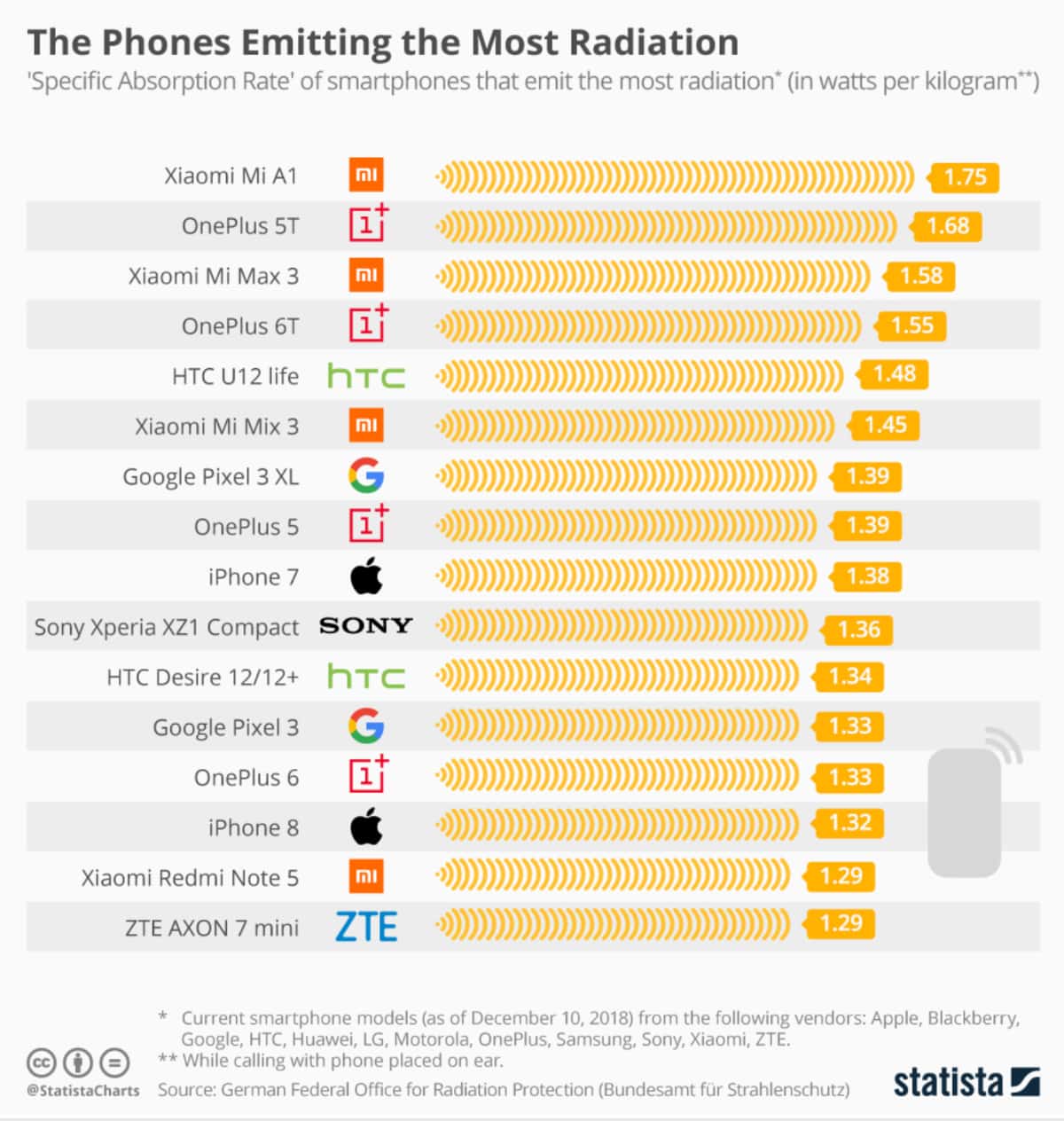 smartphone yang memiliki tingkat radiasi dari paling tinggi hingga terendah. Tipe ponsel apa saja yang masuk ke dalam daftar?