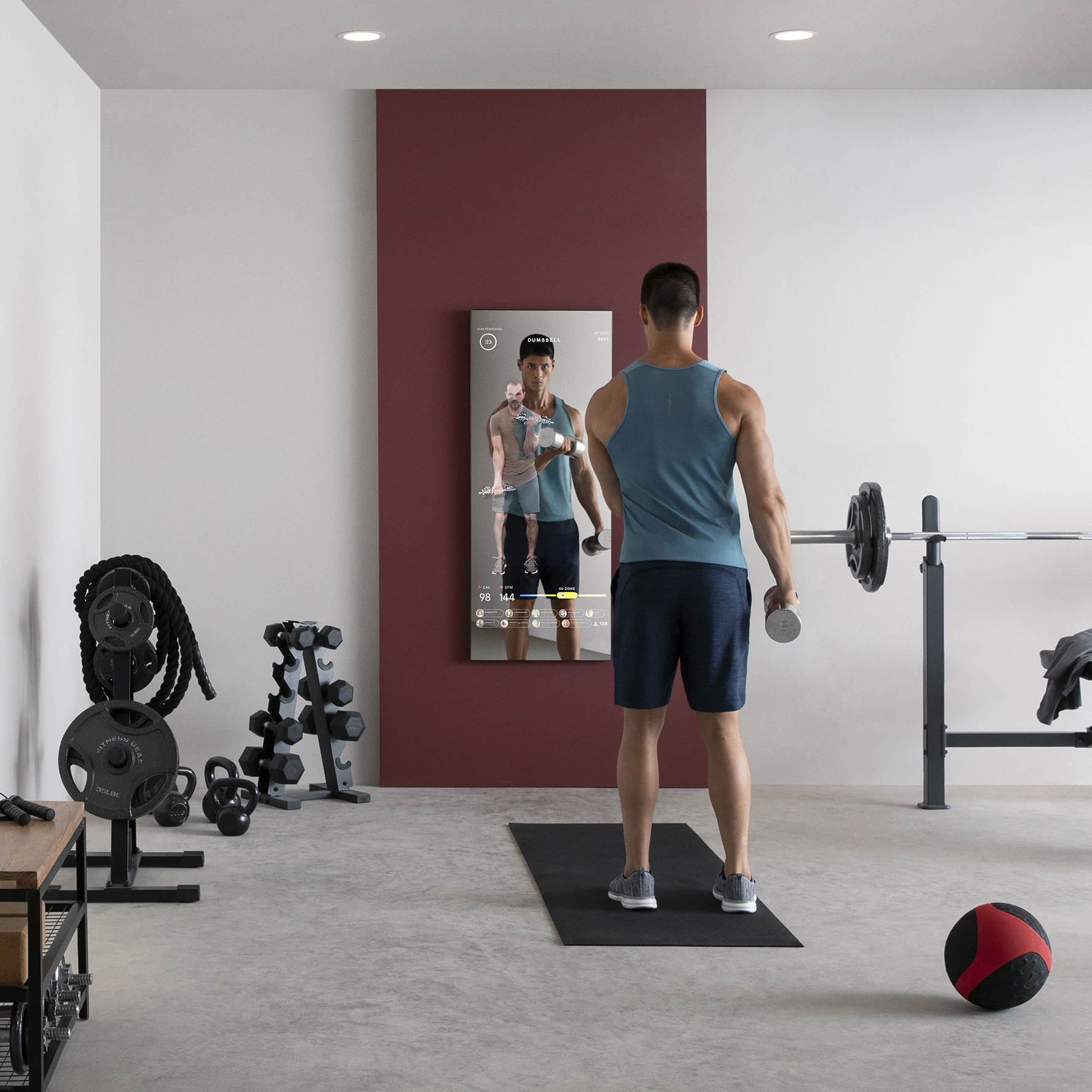 Perangkat cermin yang digunakan bisa terhubung dengan ponsel pintar, dilengkapi dengan fitness bands, dudukan, dan monitor detak jantung dengan koneksi Bluetooth.