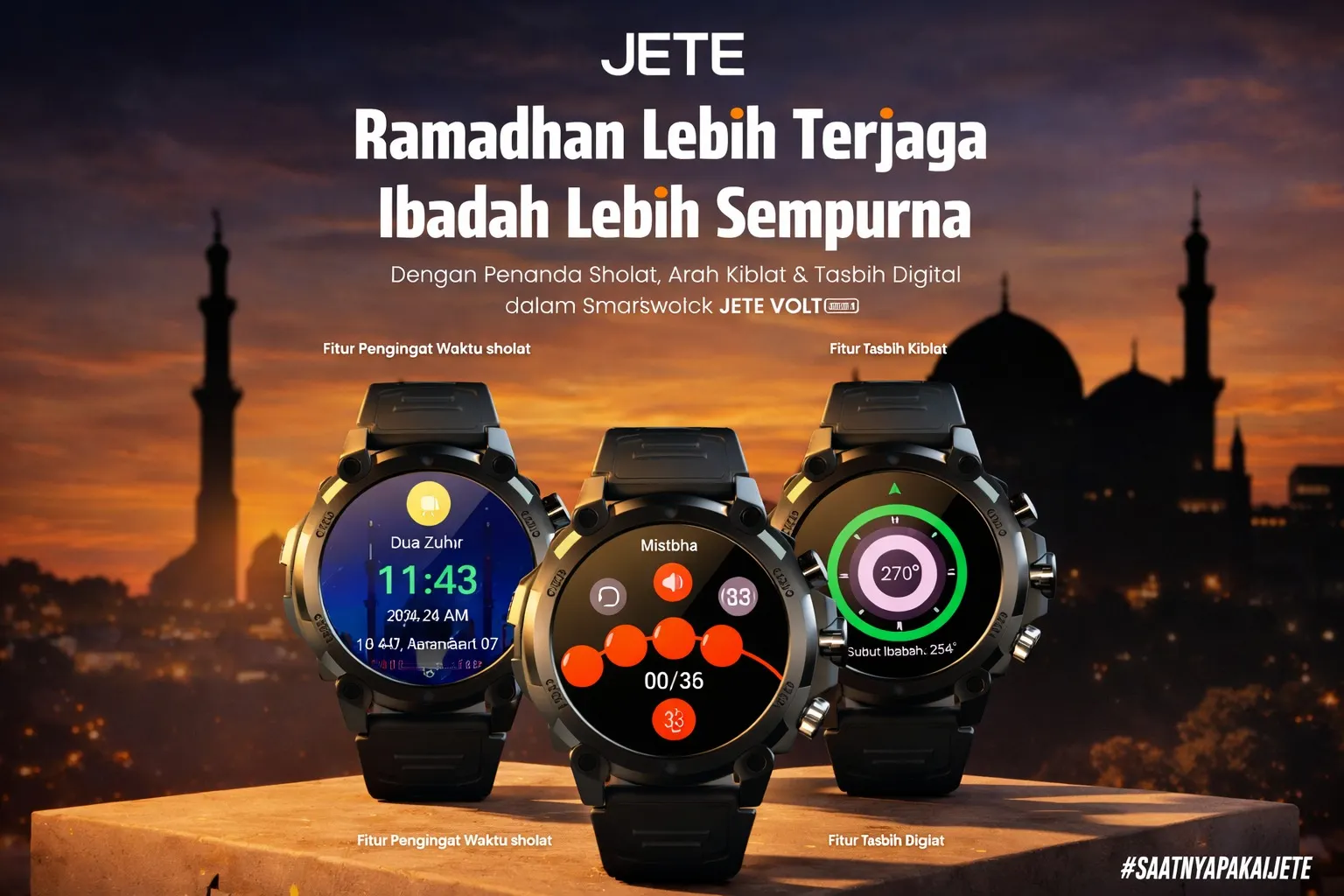 Tak hanya unggul dalam fitur teknis, JETE VOLT juga dirancang untuk mendukung gaya hidup religius penggunanya. Smartwatch ini dapat berfungsi sebagai: