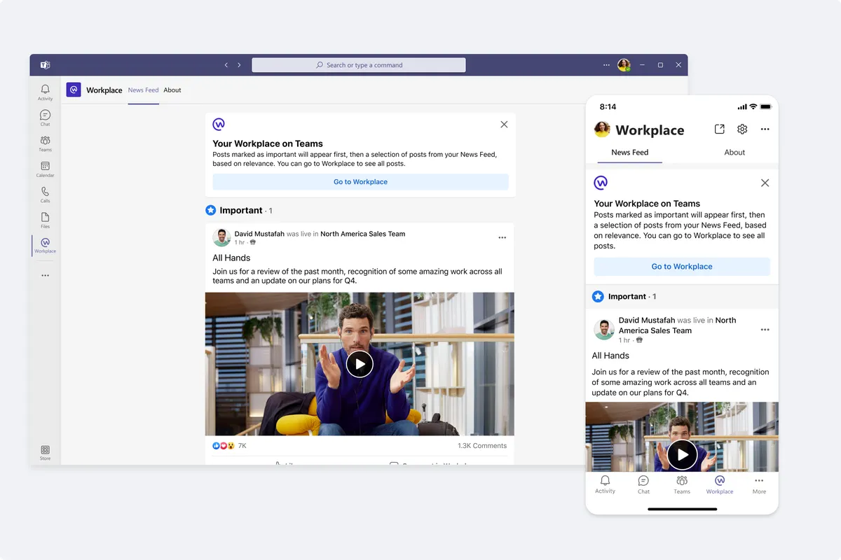 Aplikasi ini dapat disematkan secara opsional ke bilah navigasi Teams dan akan menyertakan beranda konten Workplace. Admin Microsoft Teams juga dapat menandai konten sebagai penting untuk ditampilkan di aplikasi Workplace.