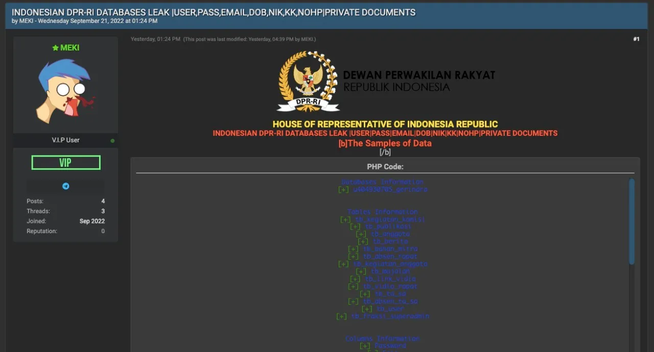 Data tesebut diposting di forum Breached.to dengan judul "INDONESIAN DPR-RI DATABASES LEAK |USER,PASS,EMAIL,DOB,NIK,KK,NOHP|PRIVATE DOCUMENTS". Di dalam utas tersebut juga Meki berulang kali menyebut kalau ini adalah data yang valid.
