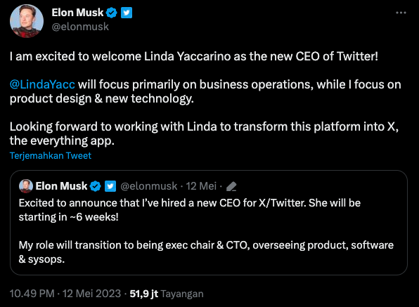"saya senang menyambut Linda Yaccarino sebagai CEO Twitter yang baru! @LindaYacc akan fokus terutama pada operasi bisnis, sementara saya fokus pada desain produk & teknologi baru. Berharap untuk bekerja sama dengan Linda untuk mengubah platform ini menjadi X, aplikasi serba ada," tulis Elon Musk.
