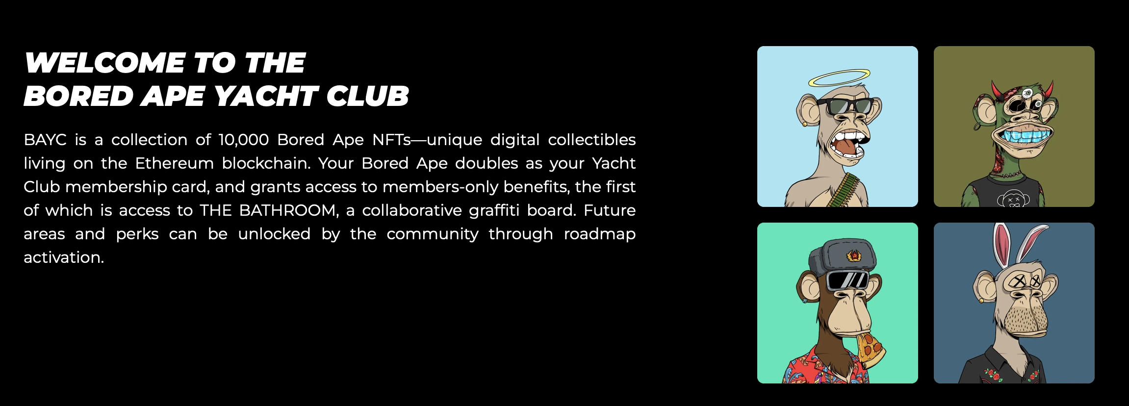 Pertama, Bored Ape Yacht Club (BAYC) membership yang bergerak di industri seni. Perusahaan ini merupakan kumpulan dari 10.000 Bored Ape NFT (non-fungible token) terbatas berbasis Ethereum. NFT ini menampilkan gambar-gambar kera yang unik dan kreatif dengan ekspresi wajah, pakaian, dan lainnya yang berbeda.