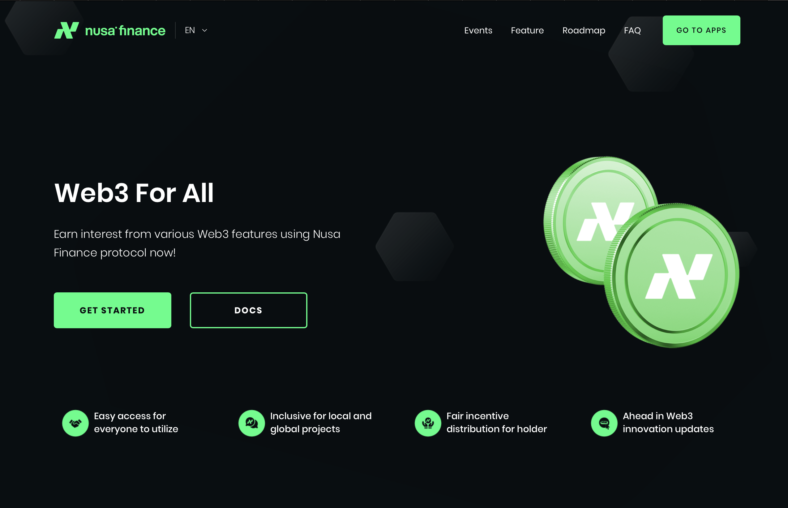Dengan slogan #Web3ForAll, Nusa Finance secara aktif berinovasi untuk menawarkan layanan keuangan yang mudah digunakan berbasis mata uang kripto, yang menawarkan kepada kamu solusi layanan semuanya ada di satu tempat, seperti Lending Market, Swap, Liquidity Provision, Farming., Airdrop, Governance Program, dan yang akan segera hadir NFT Marketplace.