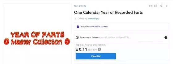 Ia menawarkan kentut NFT tersebut agar dapat diual sebagai token membuatnya menjadi kalender kentut dengan nama “Year of Farts: Master Collection” di platform OpenSea. Simfoni kentut tersebut dijual secara satuan mulai dari harga 85 dolar AS atau sekitar Rp1,2 juta.