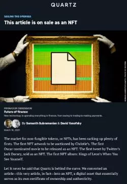 Dua orang penulis yang membahas mekanisme NFT, platform NFT OpenSea, dan cara menjual NFT ini menjadikan artikelnya sebagai NFT yang dapat diperjualbelikan. Di akhir artikel, mereka menuliskan bahwa artikel tentang NFT tersebut dapat dibeli sebagai NFT.