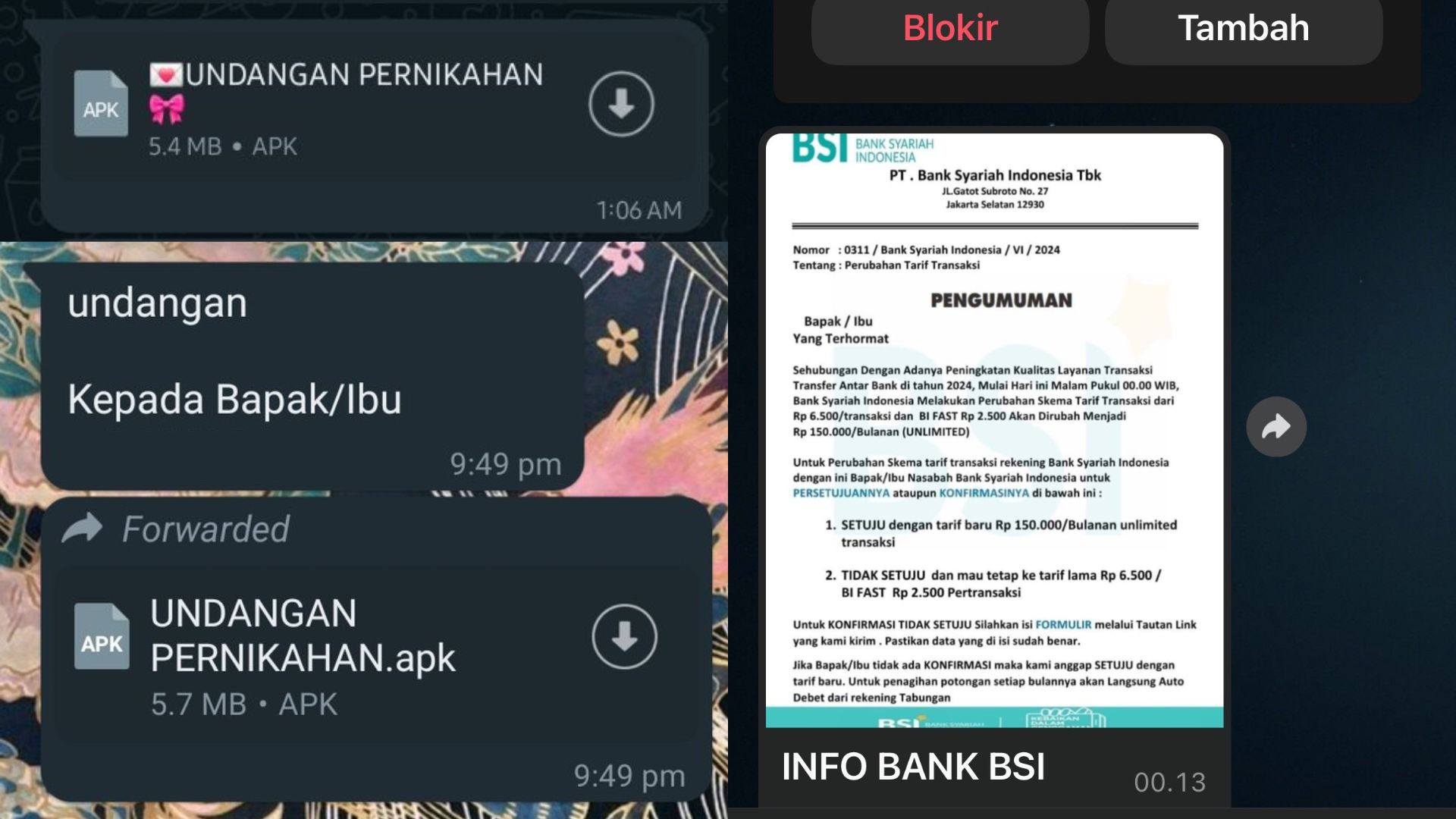 Sejak beberapa tahun lalu, memang mulai beredar modus penipuan berbentuk penyebaran link atau file .APK yang dikirim oleh nomor tidak dikenal. Biasanya, penipu menyebar link scam melalui modus undangan pernikahan, surat dari bank, hingga Tukar DANA yang menjanjikan nominal rupiah ketika pengguna pergi ke situs yang telah disediakan. Umumnya, pesan ini dikirimkan melalui WhatsApp atau SMS.