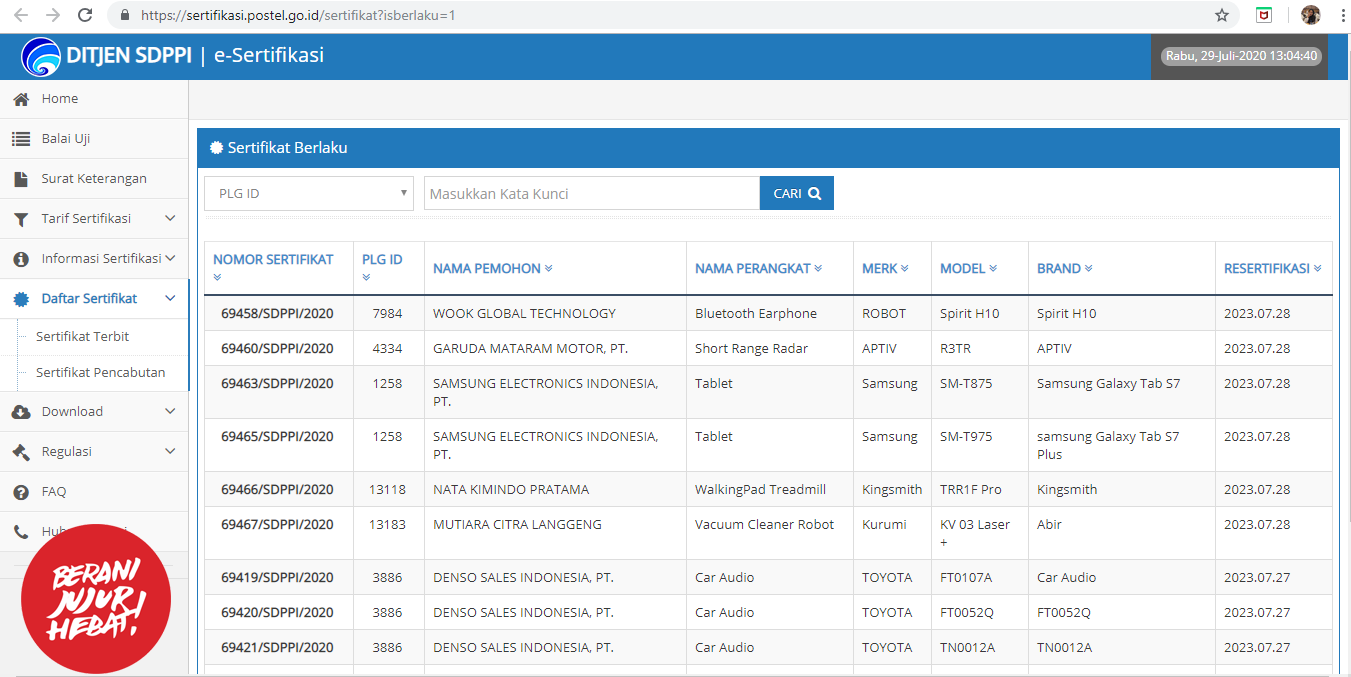 Pada dus ponsel, dekat nomor IMEI seharusnya juga ada nomor sertifikat Sumber Daya dan Perangkat Pos dan Informatika (SDPPI) Kominfo. Setelah mendapatkan informasi nomor sertifikat ponsel, kalian bisa memasukkannya ke situs Kominfo untuk mengecek lebih lengkapnya yaitu di https://sertifikasi.postel.go.id/sertifikat?isberlaku=1.