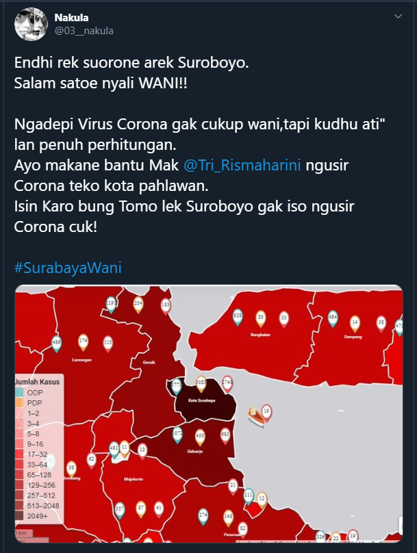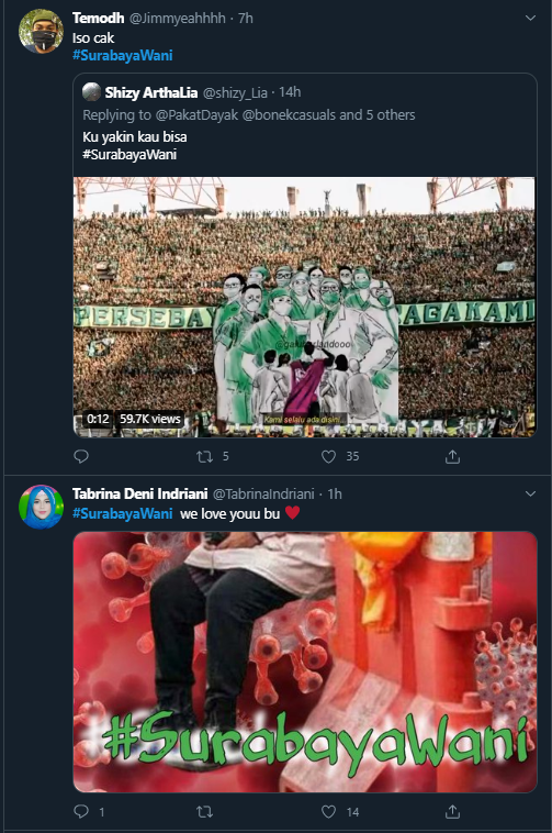 Setidaknya sudah ada 5.000 tweets yang berisikan semangat antar sesama masyarakat Surabaya yang dikirimkan melalui tagar #SurabayaWani.
