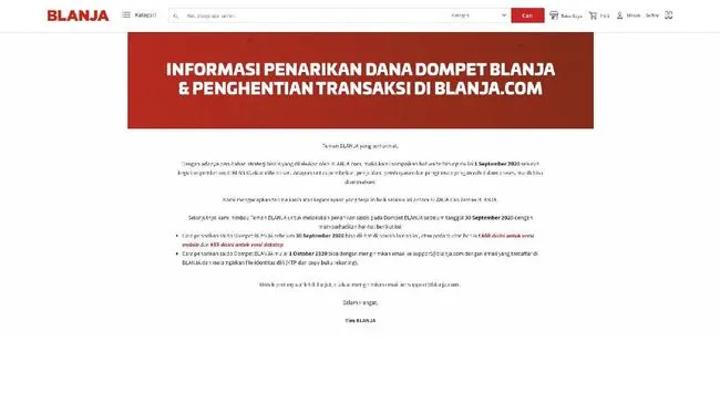Untuk melakukan penarikan saldo Dompet BLANJA setelah tanggal tersebut, bisa dilakukan dengan mengirimkan email ke support@blanja.com dengan email yang digunakan pada BLANJA dan melampirkan identitas diri seperti KTP dan fotocopy atau scan buku rekening.