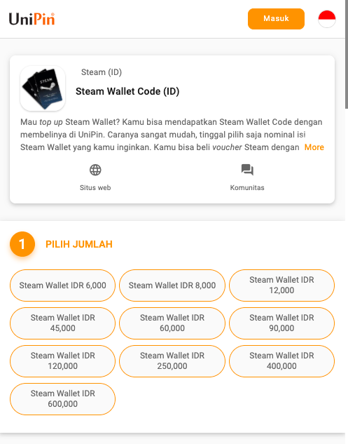 1. Buka web UniPin.com, lalu masuk ke halaman pembelian voucher Steam.