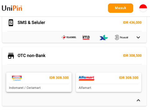 Tak hanya itu, metode pembayaran lain yang juga bisa kamu gunakan adalah pembayaran melalui Indomaret/Alfamart. Jika ingin membayar melalui Indomaret/Alfamart, tinggal pilih metode pembayaran Indomaret/Alfamart di UniPin.