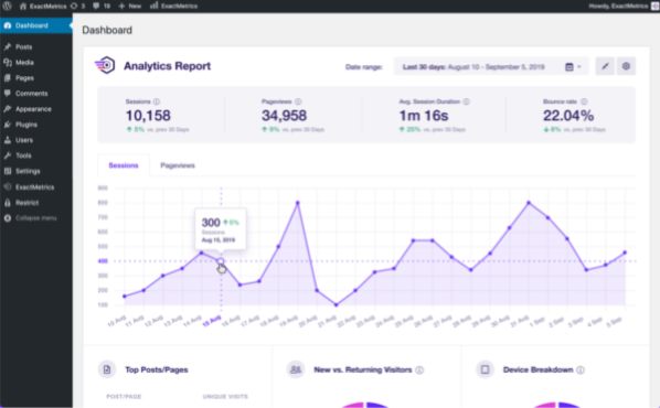 Exact Metrics adalah salah satu plugin Google Analytics terpopuler untuk WordPress. Banyak pemula merasa laporan Google Analytics agak sulit dipahami. Exact Metrics membuatnya mudah dipahami di dalam area admin WordPress. Laporan ini biasanya mencakup laporan demografi, pelacakan tautan yang disempurnakan, pelacakan tautan afiliasi, laporan waktu nyata, dan banyak lagi.