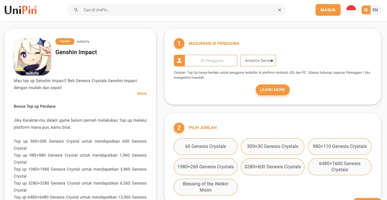 - Buka web UniPin.com, lalu masuk ke halaman top up Genshin Impact.