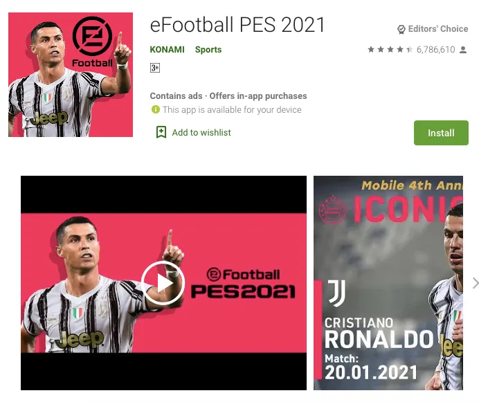 Yang pertama ada game bernama eFootball PES Mobile. Game yang dirilis oleh Konami ini merupakan salah satu game bola Android terfavorit. Terlihat dari rating yang tinggi yakni 4,4. Hingga saat artikel ini ditulis, game ini sudah diinstal lebih dari 100 juta kali.