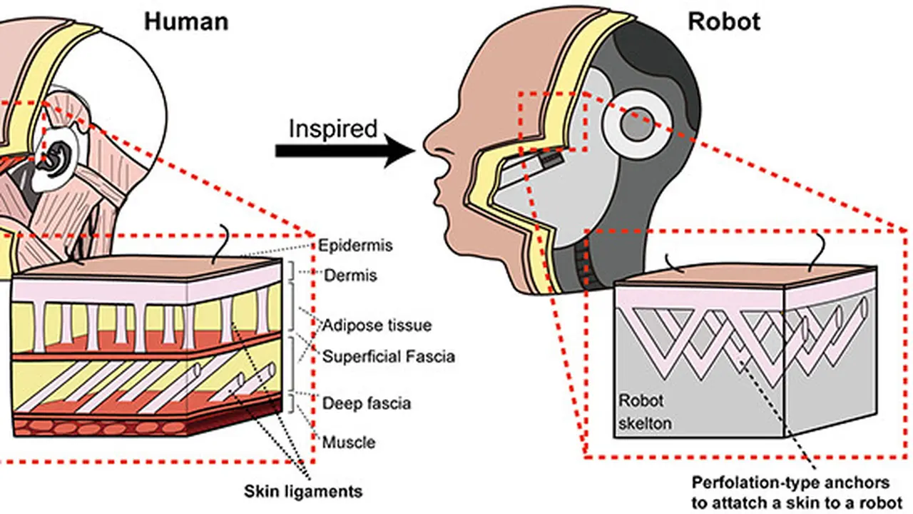 Robot dengan kulit pada wajah mereka memiliki kemampuan penyembuhan diri, kemampuan sensorik tertanam dan penampilan yang semakin mirip manusia. "Penelitian ini memperkenalkan pendekatan untuk menempelkan dan menggerakkan kulit dengan jangkar tipe perforasi, yang berpotensi berkontribusi pada kemajuan dalam robotika biohibrida."