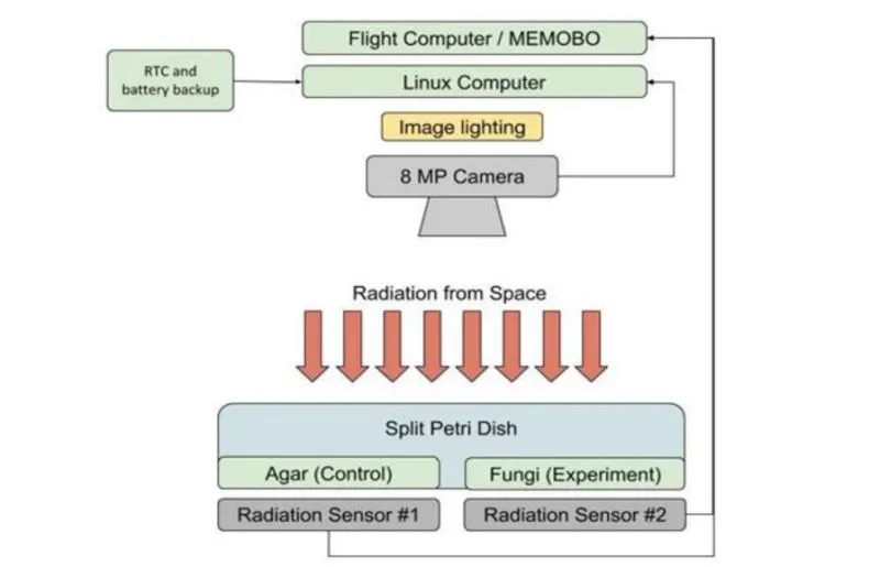 Dalam penelitian di ISS, para peneliti membandingkan cawan petri yang berisi jamur C. sphaerospermum dan cawan petri yang tidak berisi jamur. Di bawahnya, sepasang detektor radiasi terhubung ke perangkat Raspberry Pi untuk menangkap tingkat radiasi, dan mengukur kelembaban, suhu, aliran dan parameter lainnya.