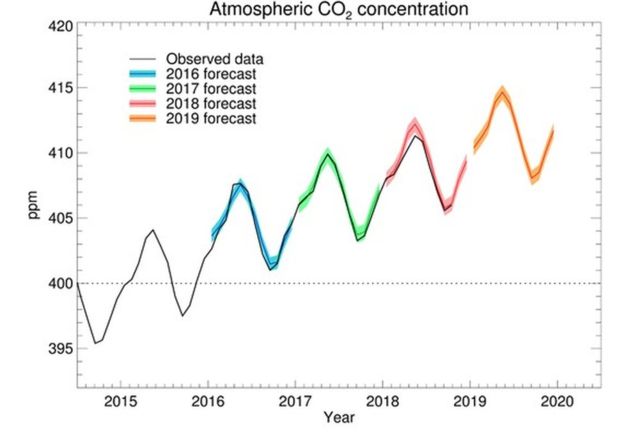 Perkiraan konsentrasi CO₂ di Mauna Loa selama 2019 (oranye), bersama dengan konsentrasi perkiraan sebelumnya untuk 2016 (biru), 2017 (hijau), 2018 (pink) dan pengukuran Scripps Institute (hitam). Met Office.