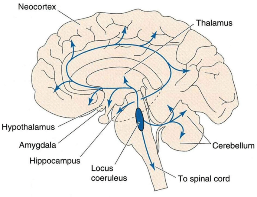 Noradrenaline adalah kandungan yang berperan penting ke fungsi otak, tepatnya pada atensi dan gairah, serta pola pikir dan motivasi. Noradrenaline di otak diproduksi oleh locus coeruelus yang berada di bagian belakang otak. Studi sebelumnya mengungkapkan bahwa penderita penyakit otak yang sejenis Parkinson Disease yaitu Progressive Supranuclear Palsy atau PSP kehilangan sedikitnya 90% locus coeruelus mereka.