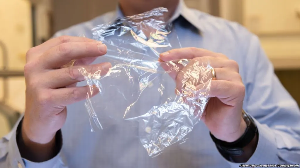 Carson Meredith, Profesor di Georgia Tech's School of Chemical and Biomolecular Engineering, menunjukkan "plastik" jenis baru yang bisa terurai.