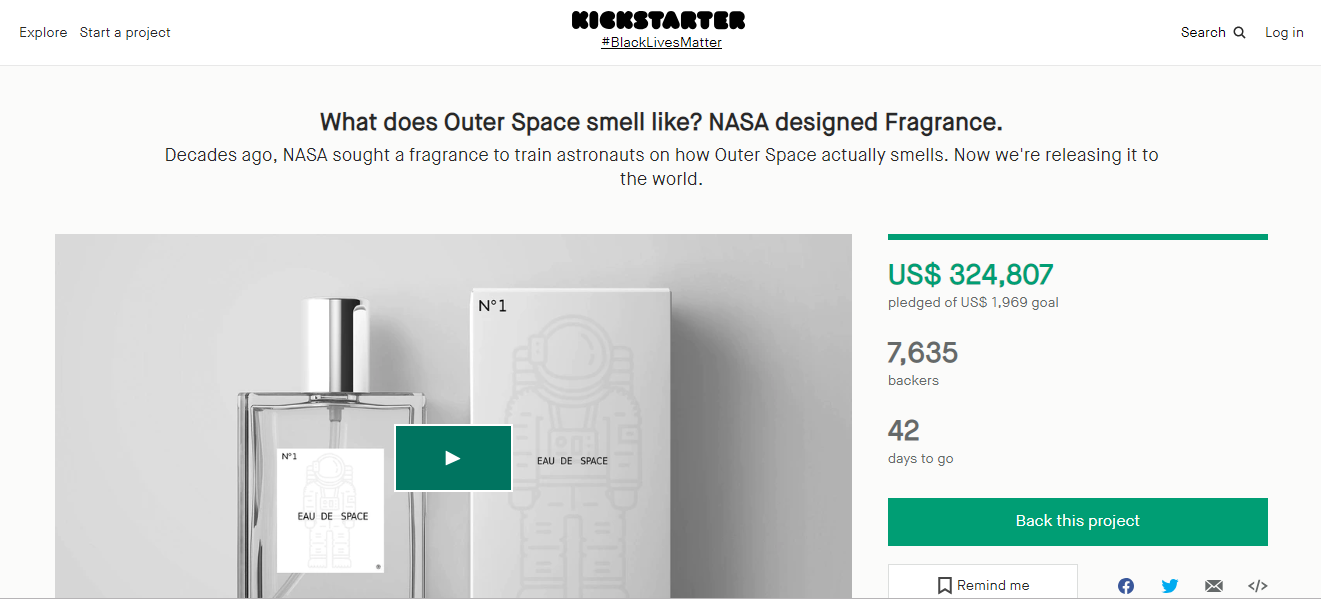 NASA telah menggalang dana lewat Kickstarter dengan harapan mendapatkan total 1.969 dolar AS atau 28,2 juta rupiah. Hingga saat ini, sudah ada 2.553 orang yang menyumbangkan dana ke parfum luar angkasa ini. Jumlah dana yang terkumpul bahkan sudah melebihi target, yakni 91 ribu dolar AS atau sekitar Rp1,3 miliar.