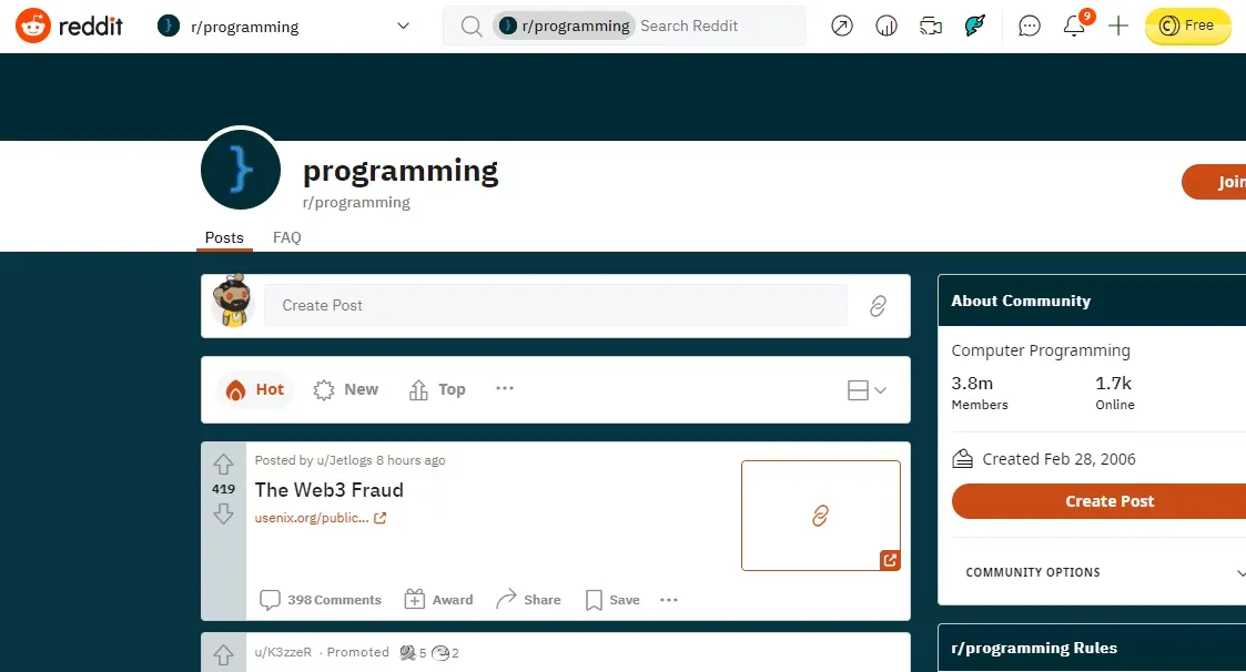 R / programming adalah situs dari Reddit atau Subreddit yang populer di mana kamu dapat mendiskusikan pemrograman dan mengikuti semua yang terjadi di industri pemrograman. Subreddit ini sudah memiliki lebih dari 3,8 juta anggota, dan situs ini adalah komunitas yang aktif. Tapi, Subreddit ini hanya untuk diskusi, jadi kamu tidak bisa mendapatkan bantuan pemrograman dari sini.