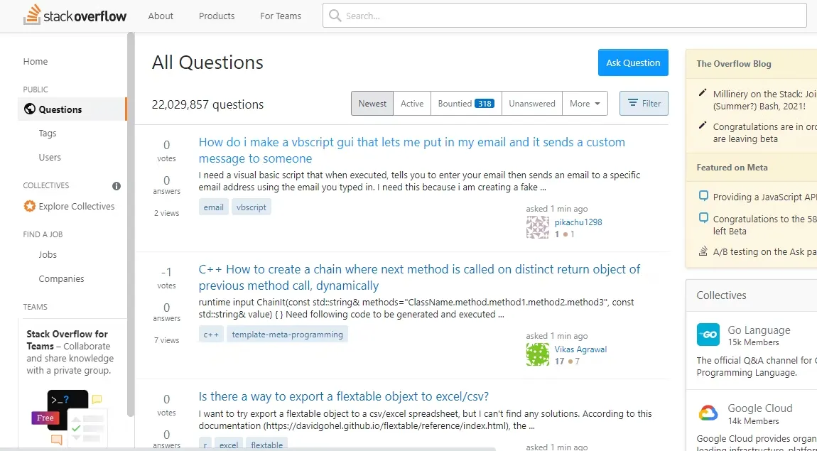 Meskipun Stack Overflow memiliki perpustakaan besar pertanyaan yang dijawab, jika pertanyaan dalam pikiran kamu belum pernah dijawab sebelumnya, kamu dapat menanyakannya dan mendapatkan balasan dalam waktu singkat.