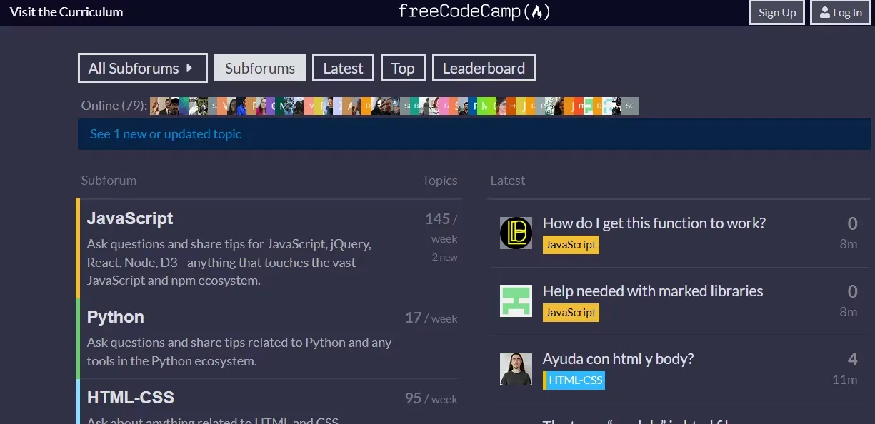 Di freeCodeCamp, ada sub-forum untuk JavaScript, HTML, CSS, Python, Project feedback, dan Career advice. Demikian pula, kamu dapat bergabung dengan sub-forum yang tersedia dari berbagai bahasa seperti Spanyol, Cina, Italia, dan Portugis untuk mendapatkan bantuan yang diperlukan.