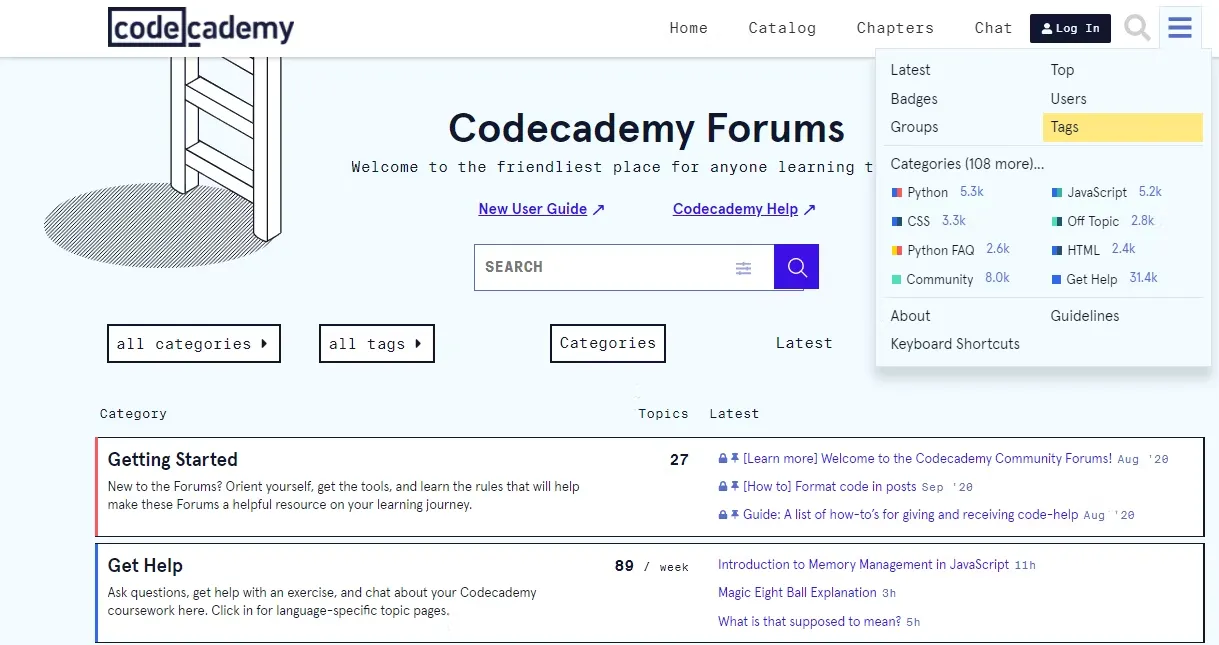 CodeAcademy adalah situs lain untuk belajar kode secara gratis. Tetapi yang lebih penting, CodeAcademy ini memiliki komunitas developer yang dapat membantu kamu. CodeAcademy juga memiliki forum online melalui server Discord.