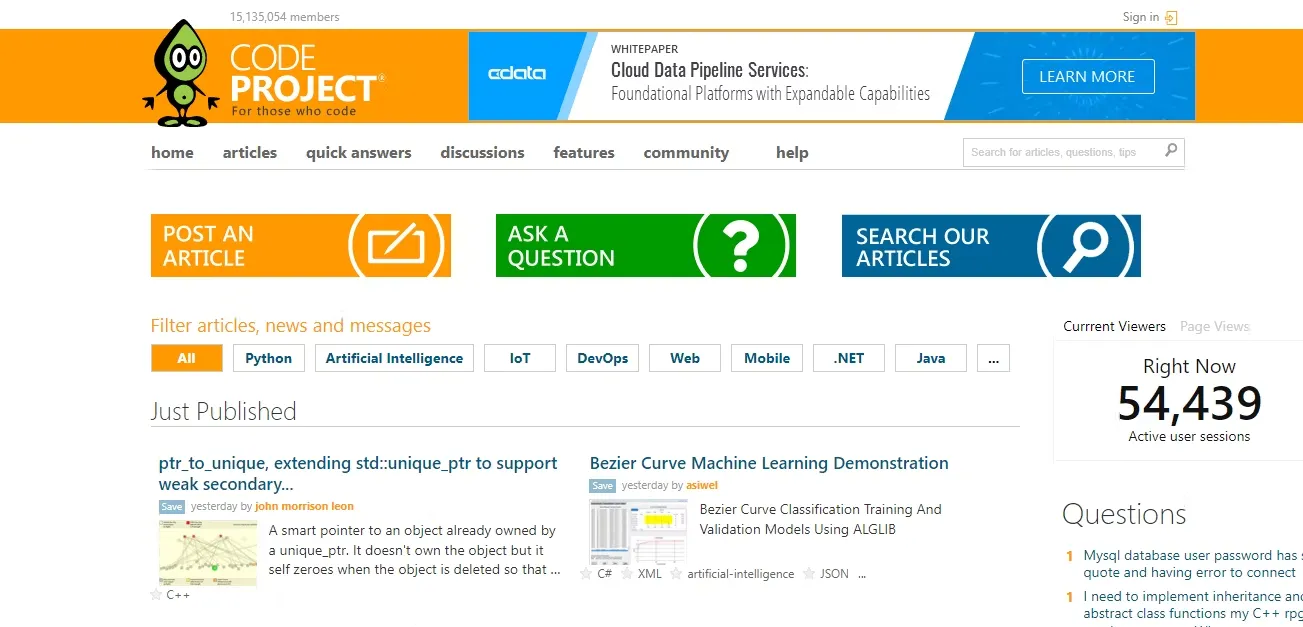 CodeProject adalah situs dengan 15 juta anggota forum yang kuat dari developer. Ada beberapa board yang tersedia di sini, dibagi ke dalam kategori yang berbeda.