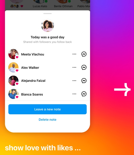 Instagram juga menambahkan kemampuan bagi pengguna untuk bereaksi dengan cepat terhadap catatan teman mereka dengan suka. Untuk menyukai catatan, pengguna akan diminta untuk mengklik ikon hati dilembar balasan atau cukup mengetuk dua kali catatan tersebut seperti yang mereka lakukan pada gulungan atau kiriman.