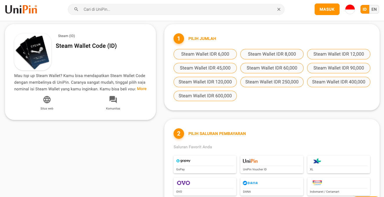 - Buka web UniPin.com, lalu masuk ke halaman pembelian Steam Wallet.