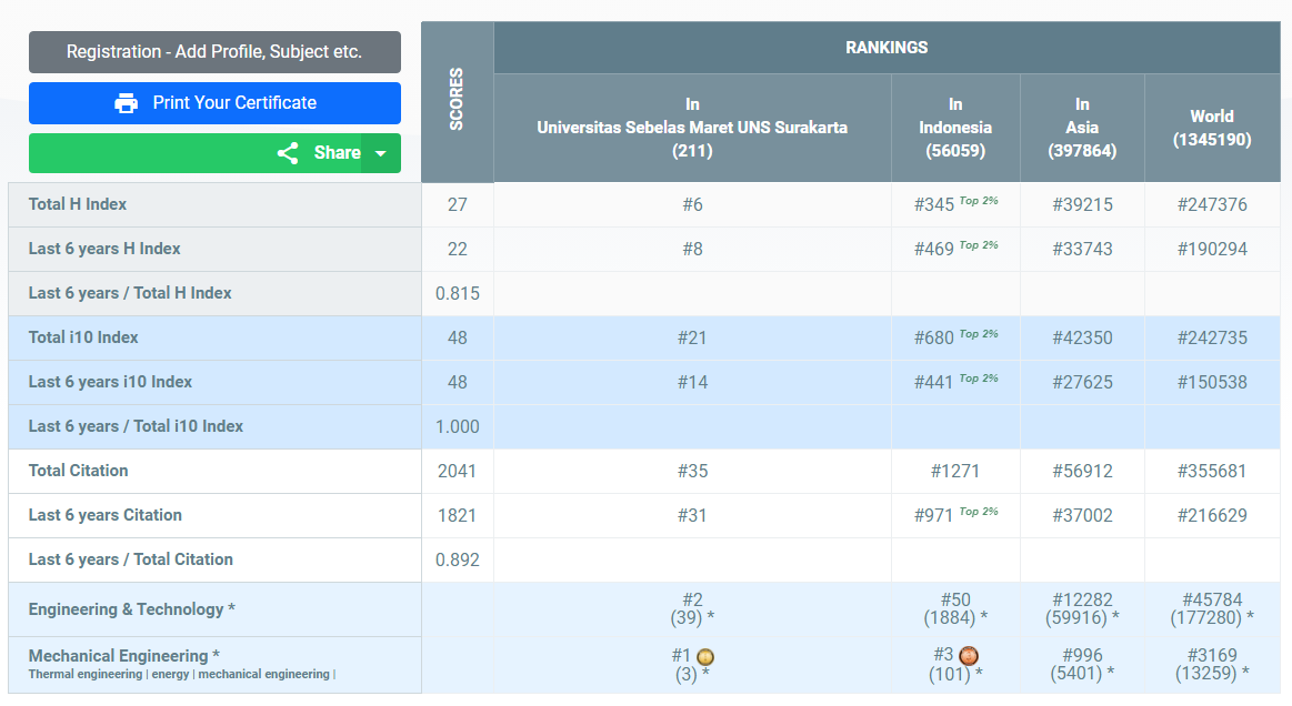 Dengan hasil skor yang tertera di bawah, Agung Tri Wijayanta menempati peringkat #6 Universitas, #345 Indonesia, #39215 Asian, dan #247376 Dunia secara keseluruhan subjek yang termasuk ke dalam kategori AD Scientific Index 2023.