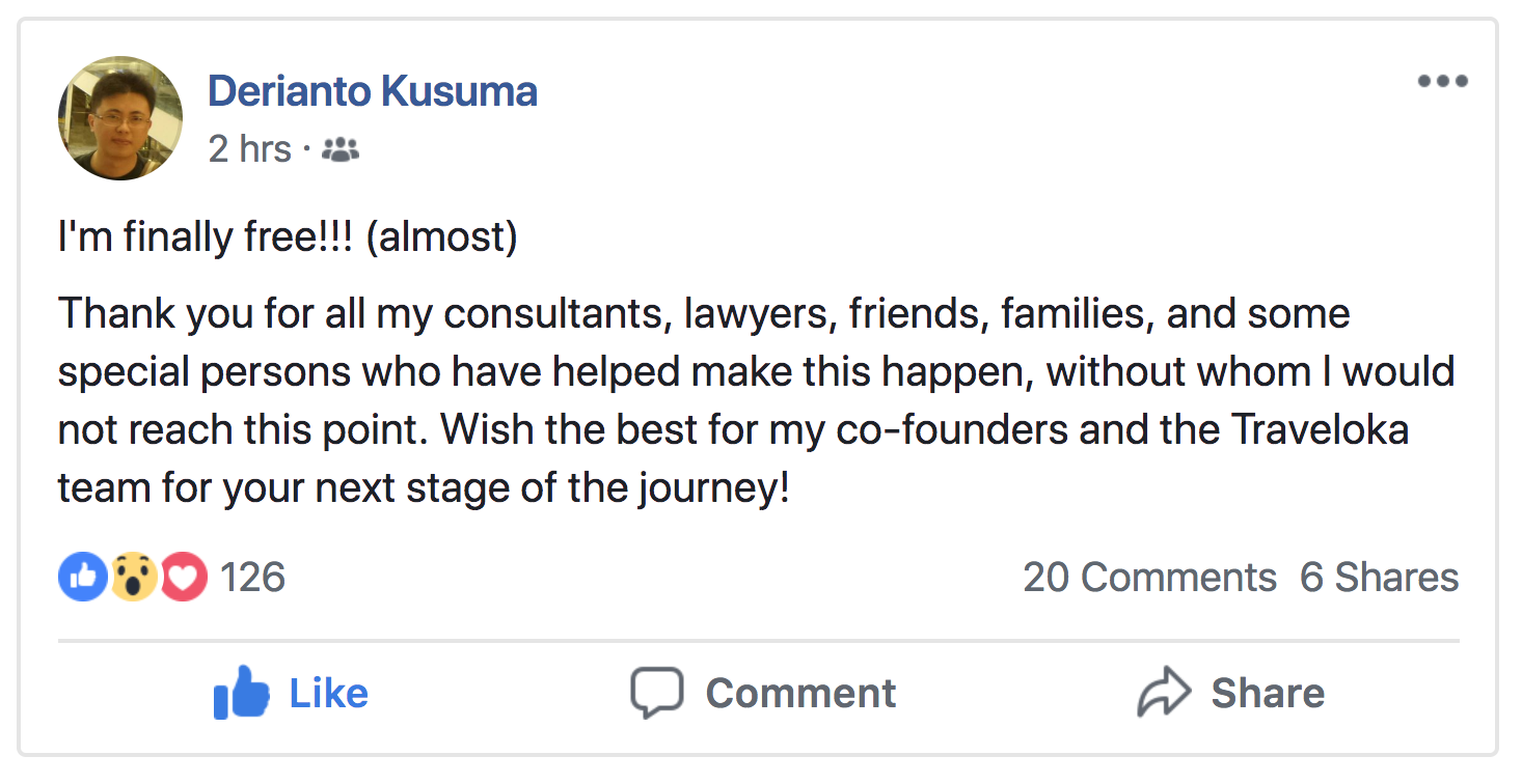 Hari ini, Traveloka mengumumkan pengunduran diri co-founder Derianto Kusuma dari posisinya sebagai Chief Technology Officer, efektif 30 November 2018.