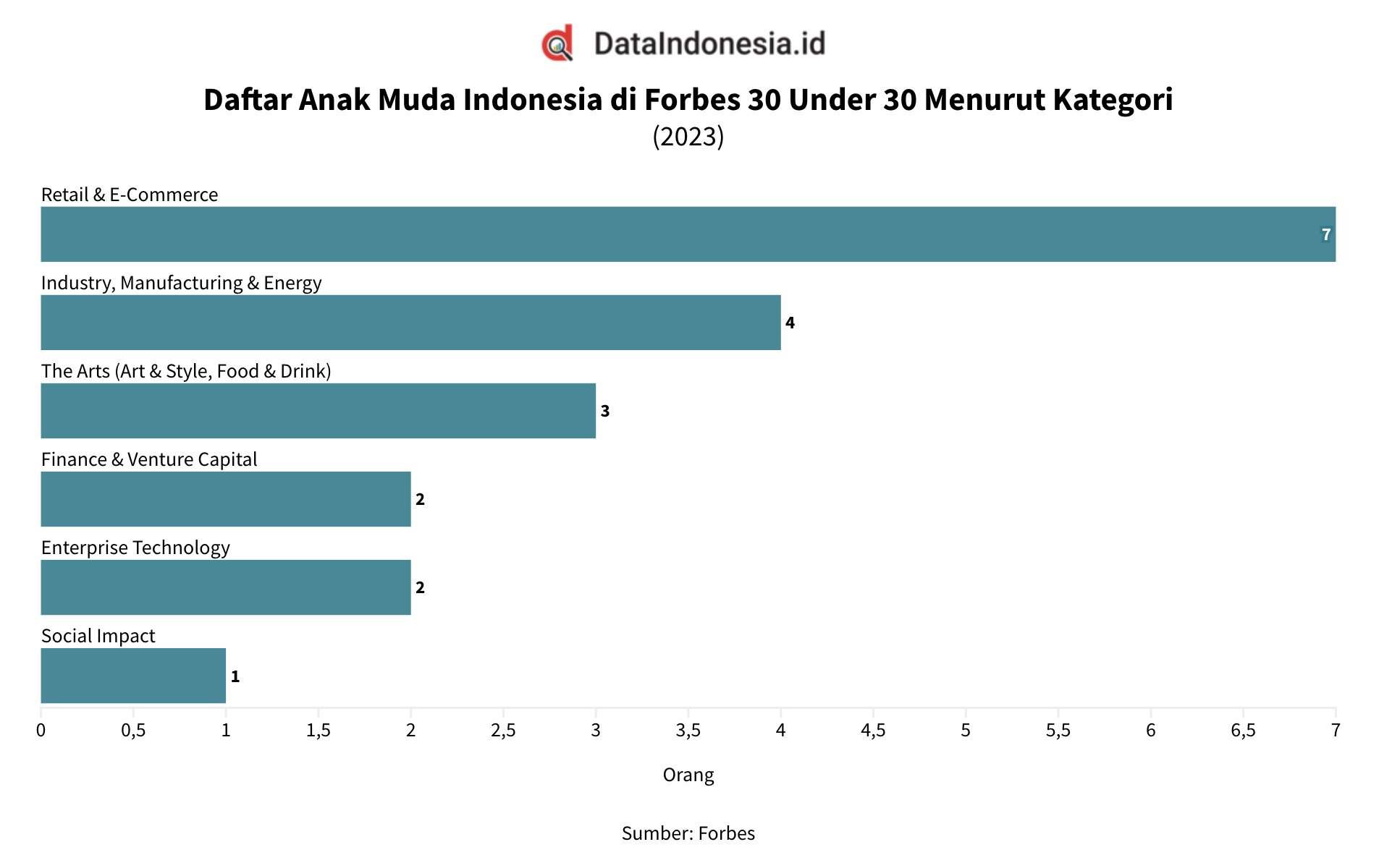Tahun 2023 ini, Forbes telah merilis daftar 30 Under 30 Asia. Berdasarkan hasil tersebut, setidaknya terdapat 19 anak muda dari Indonesia yang berhasil masuk ke dalam daftar tersebut. Jika dilihat dari kategorinya, Retail & E-commerce merupakan kategori yang paling banyak didapatkan oleh talenta muda Indonesia dengan jumlahnya yang mencapai tujuh orang.