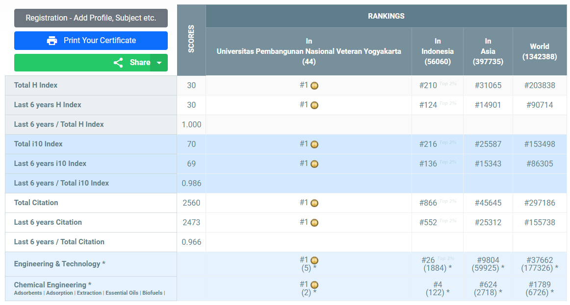 Teknologi.id - Heri Septya Kusuma menjadi Dosen tetap di Universitas Pembangunan Nasional Veteran Yogyakarta dan menempati peringkat 30 'Indonesia Top 10.000 Scientist' kategori Subjek Engineering & Technology. Pemeringkatan ini dilakukan oleh AD Scientific Index yang merupakan sistem pemeringkatan dan analisis tahunan berdasarkan kinerja ilmiah dan produktivitas dari sebuah universitas dan/atau seorang ilmuan.
