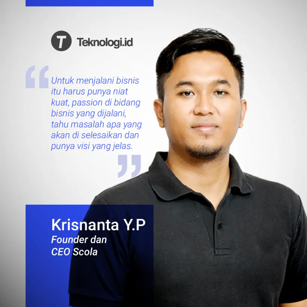 Halo Hackers dan Founders! Di #SelasaMoodBooster kali ini, Teknologi.id akan mengulas kisah salah seorang startup founder di bidang pendidikan yaitu Krisnanta Y.P atau biasa disapa Krisna, selaku CEO dan Founder dari Scola. Scola sendiri adalah sebuah startup di bidang pendidikan yang berfokus pada pengembangan teknologi dan mengintegrasikan pendidikan dengan teknologi informasi. Misi Scola adalah menciptakan inovasi-inovasi teknologi di dunia pendidikan yang dapat membantu meningkatkan mutu pendidikan di Indonesia.