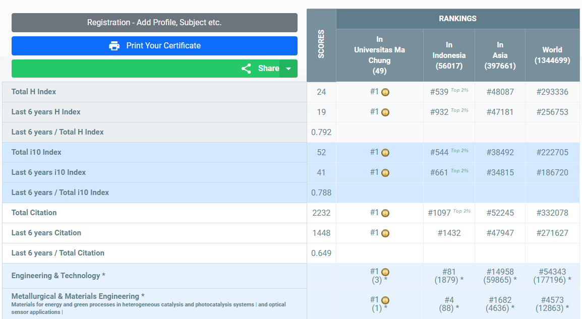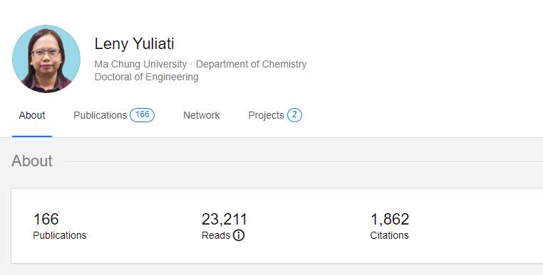 Teknologi.id - Leny Yuliati menjadi Dosen di Universitas Ma Chung menempati peringkat 75 'Indonesia Top 10.000 Scientist' kategori Subjek Engineering & Technology. Pemeringkatan ini dilakukan oleh AD Scientific Index yang merupakan sistem pemeringkatan dan analisis tahunan berdasarkan kinerja ilmiah dan produktivitas dari sebuah universitas dan/atau seorang ilmuan.