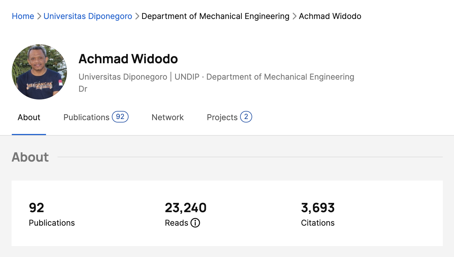 Pada akun Google Scholar milik Dr. Eng. Achmad Widodo, S.T., M.T. terdaftar 214 publikasi sejak tahun 2004 hingga saat ini (2023). Sedangkan pada Research Gate miliknya, Dr. Eng. Achmad Widodo, S.T., M.T. memiliki 92 publikasi dengan sitasi sebanyak dengan sitasi 3.693.
