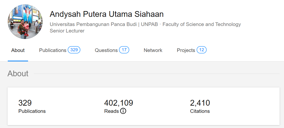Berikut beberapa publikasi populer dari Andysah Putera Utama Siahaan, S.Kom., M.Kom., Ph.D. yang terdaftar pada akun Google Schoolar-nya, beserta dengan tahun rilis dan juga jumlah sitasi di setiap publikasinya.