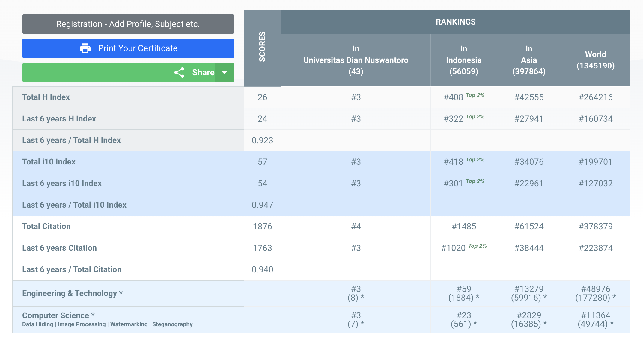 Dengan hasil skor yang tertera di bawah, Christy Atika Sari menempati peringkat #3 Universitas (Universitas Dian Nuswantoro), #408 Indonesia, #42555 Asia, #264216 Dunia secara keseluruhan subjek yang termasuk ke dalam kategori AD Scientific Index 2023.