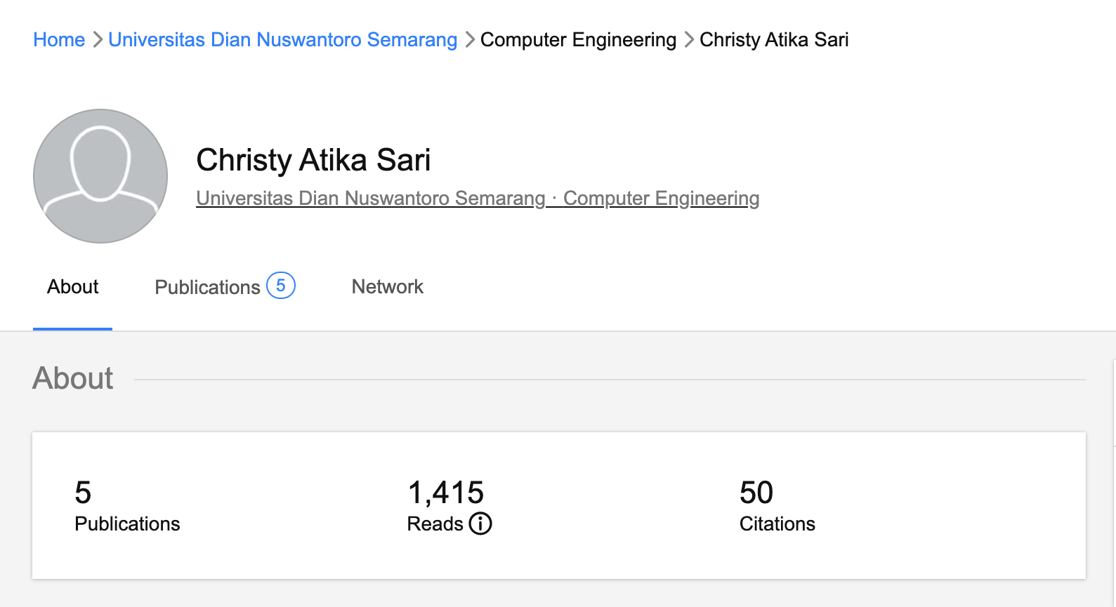 Pada akun Google Scholar milik Christy Atika Sari M.Kom terdaftar 184 publikasi sejak tahun 2012 hingga 2022. Sedangkan pada Research Gate miliknya, Christy Atika Sari M.Kom memiliki 5 publikasi dengan jumlah sitasi sebanyak 50.