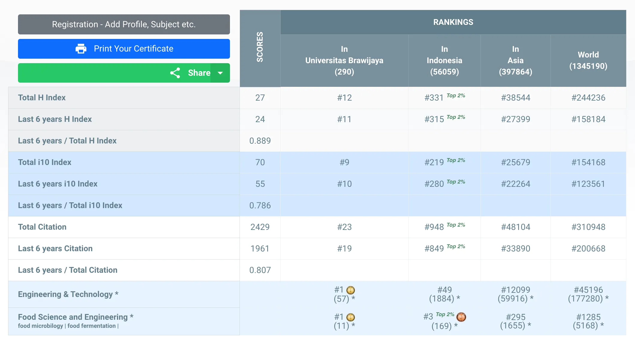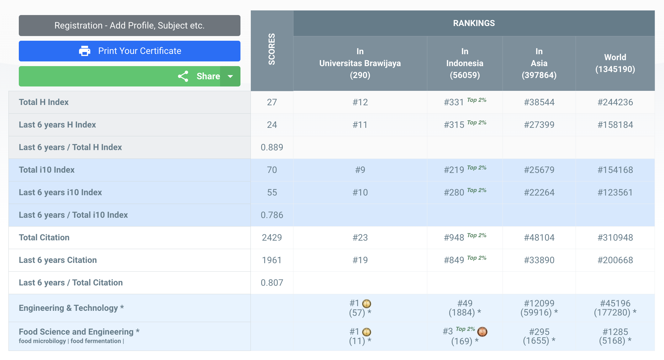 Dengan hasil skor yang tertera di bawah, Elok Zubaidah menempati peringkat #12 Universitas (Universitas Brawijaya), #321 Indonesia, #37679 Asia, #239989 Dunia secara keseluruhan subjek yang termasuk ke dalam kategori AD Scientific Index 2023.
