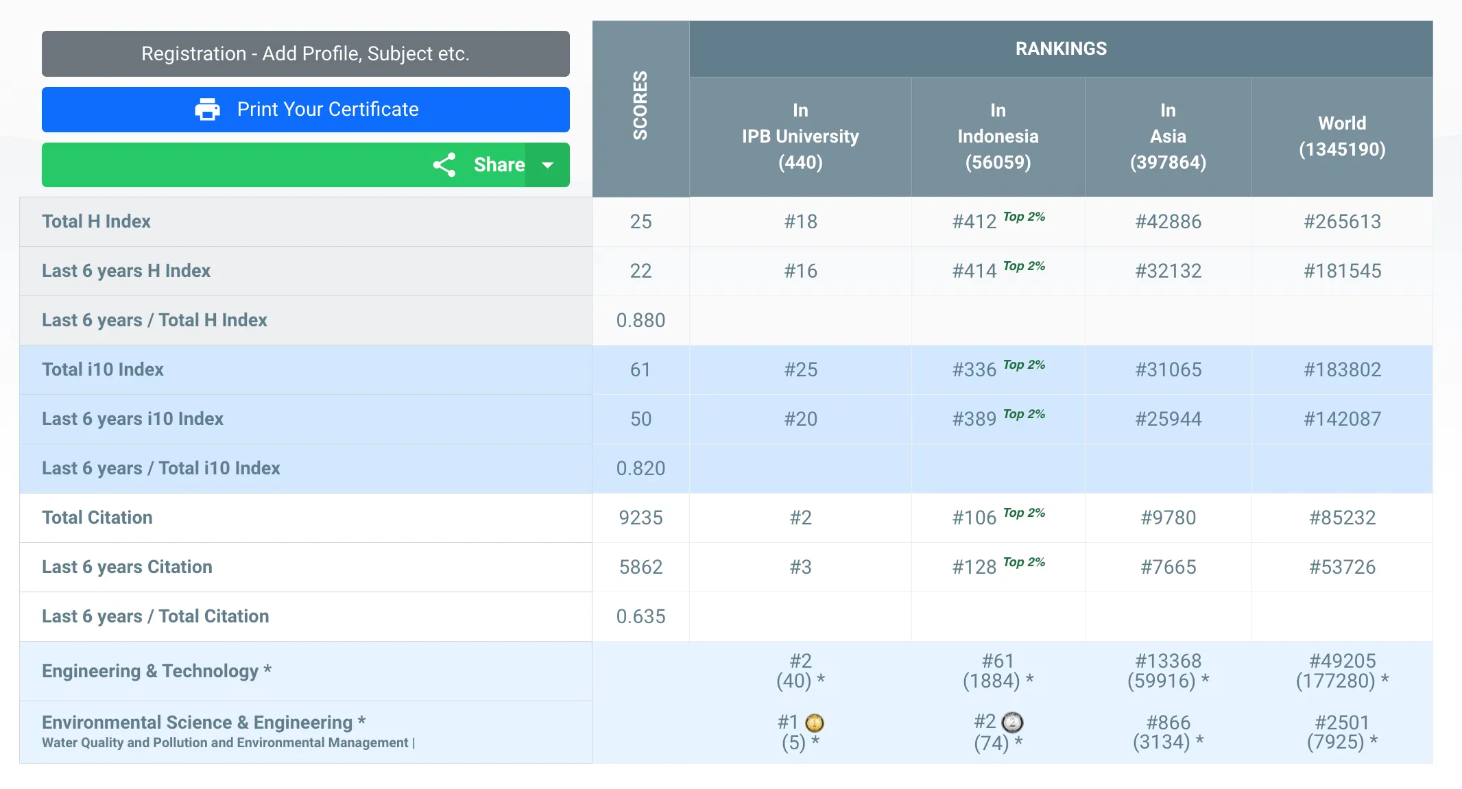 Dengan hasil skor yang tertera di bawah, Hefni Effendi menempati peringkat #18 Universitas (IPB University), #412 Indonesia, #42886 Asia, #265613 Dunia secara keseluruhan subjek yang termasuk ke dalam kategori AD Scientific Index 2023.