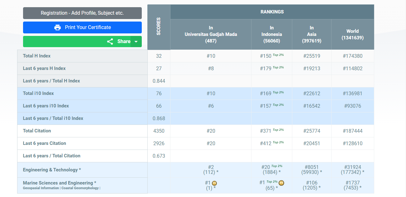 Dengan hasil skor yang tertera di bawah, Ma Marfai menempati peringkat #10 Universitas, #150 Indonesia, #25519 Asian, dan #174380 Dunia secara keseluruhan subjek yang termasuk ke dalam kategori AD Scientific Index 2023.