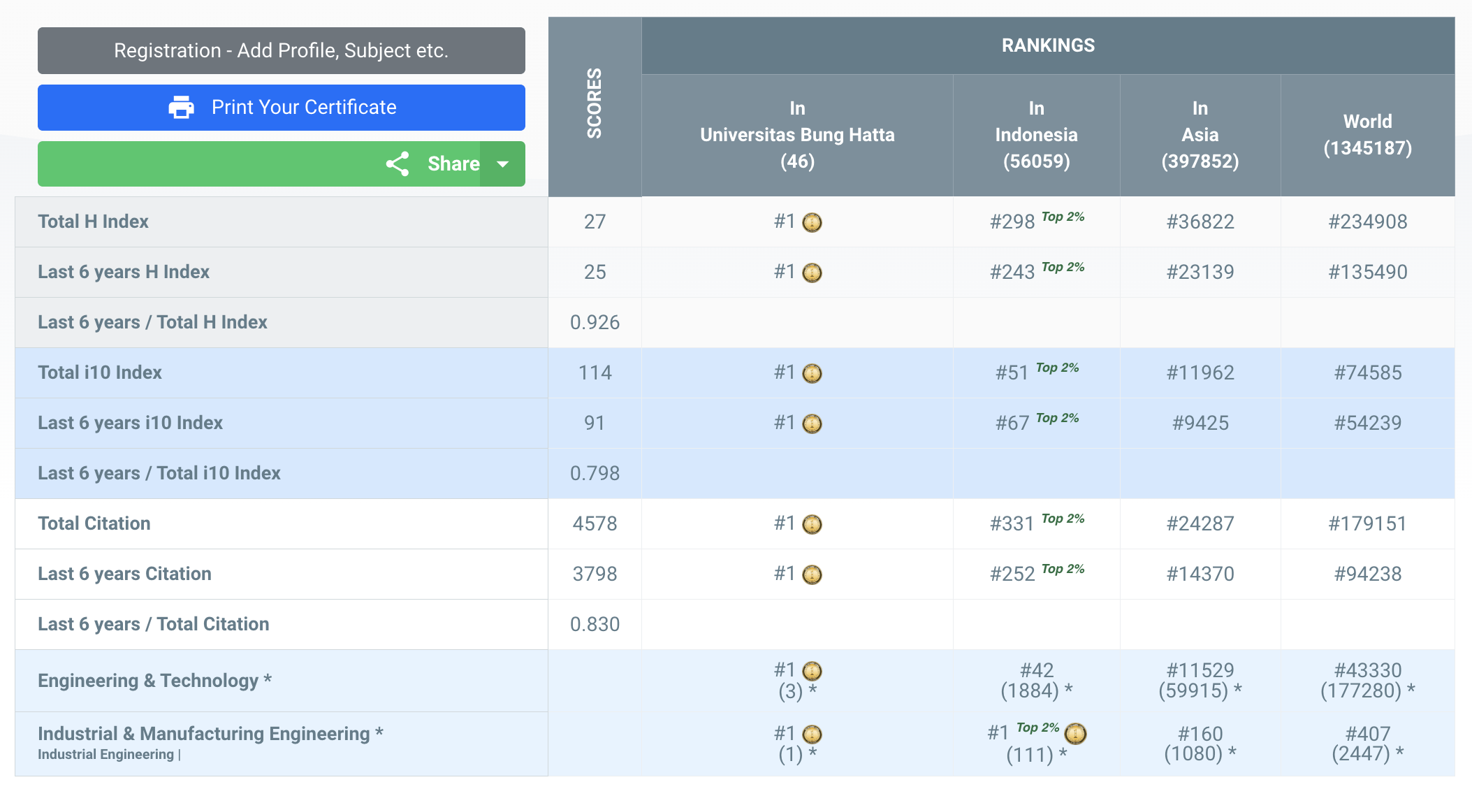 Dengan hasil skor yang tertera di bawah, Muhibbullah Azfa Manik menempati peringkat #1 Universitas (Universitas Bung Hatta), #298 Indonesia, #36822 Asia, #234908 Dunia secara keseluruhan subjek yang termasuk ke dalam kategori AD Scientific Index 2023.