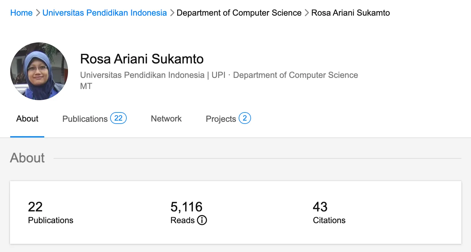 Pada akun Google Scholar milik Rosa Ariani Sukamto, S.T., M.T. terdaftar 104 publikasi sejak tahun 2004 hingga 2022. Sedangkan pada Research Gate miliknya, Rosa Ariani Sukamto, S.T., M.T. memiliki 22 publikasi dengan sitasi sebanyak dengan sitasi 43.