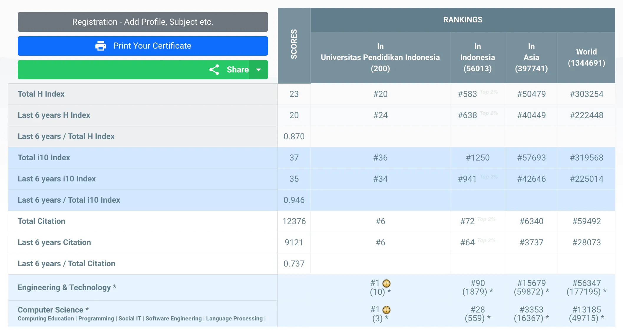 Dengan hasil skor yang tertera di bawah, Rosa Ariani Sukamto menempati peringkat #20 Universitas (Universitas Pendidikan Indonesia), #583 Indonesia, #50479 Asia, #303254 Dunia secara keseluruhan subjek yang termasuk ke dalam kategori AD Scientific Index 2023.